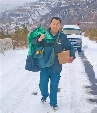 图为赵元瑞在雪中送件。