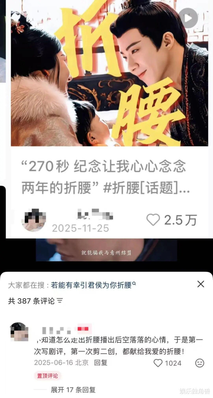 小红书也巧妙运用了垂类圈层发酵势头,进一步驱动内容传播,让讨论的渗透力更强。《折腰》播出前,通过拍摄路透、“原著VS剧版改编期待”等讨论扩大路人盘,在播出阶段提振UGC群体发repo热情,构建了一个需要先观看、再表达的深度内容场域,使讨论既多元热闹,也有质感。作品播出后,不同观众群体也自然发酵出一些意想不到的破圈点,就比如《折腰》播出后,因为幕后剪辑团队仅有四人,而在小红书引爆了第一个话题。