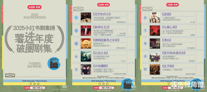 为了让这种变化更清晰可见,小红书也通过剧集榜单将这种趋势结构化呈现。榜单用三个维度呈现了真实口碑讨论的分布图景与生长轨迹,“薯选剧集榜”反映了剧集真实讨论热度与口碑;“破圈剧集榜”对应剧集内容在多元化的兴趣社群里自然发酵的可能性;“角色榜”验证有哪些人物真正“活”出了剧集周期。