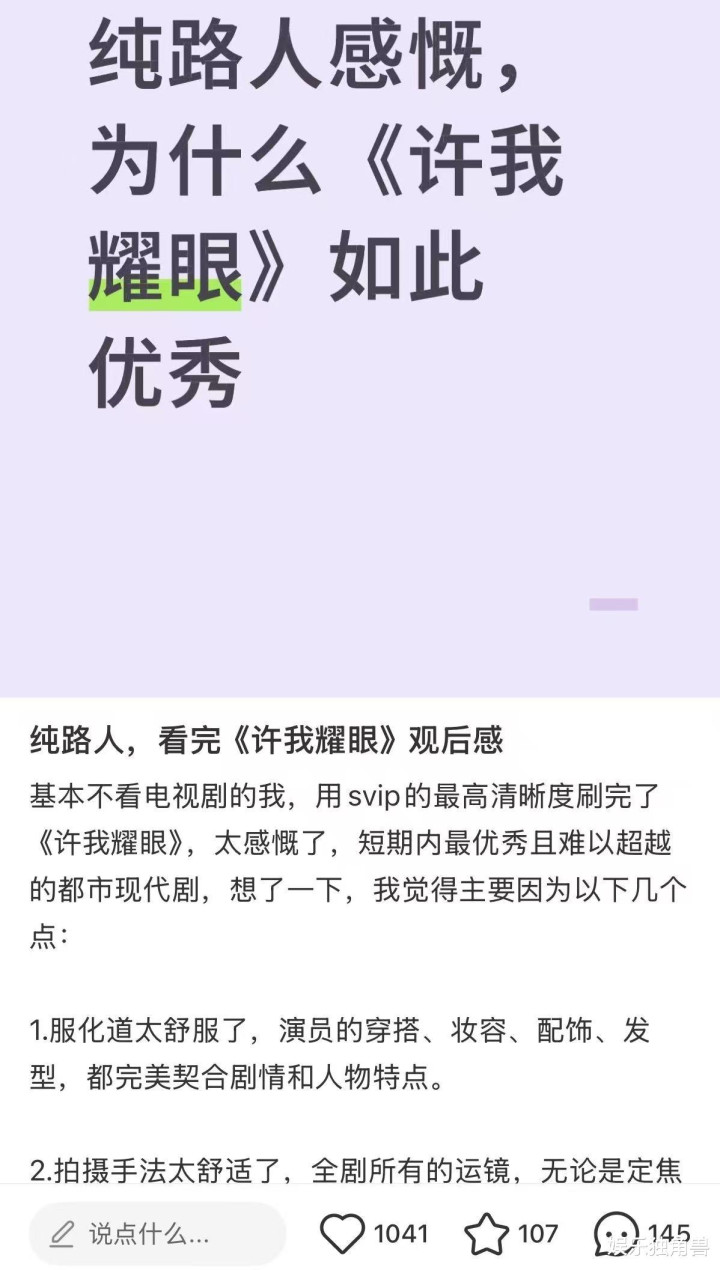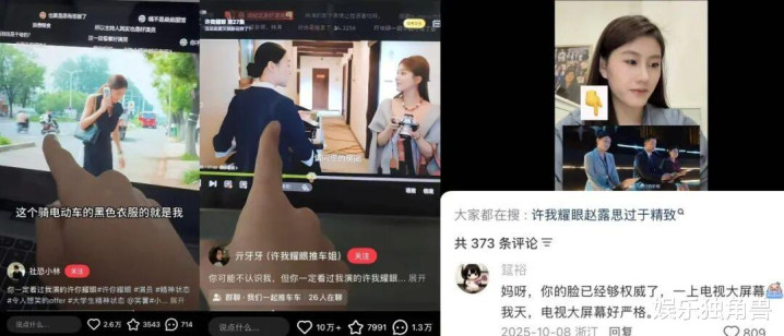 一些头部剧集也在这样的圈层共振下将热度推向极致。就比如爆剧《许我耀眼》内容被拆解为各种可被再创作的“社会切片”。“妍学”成为职场与女性议题的讨论入口,许妍的穿搭与妆容被时尚、美妆博主反复演绎,让剧播期间全程都能衍生新鲜梗。也有博主另辟蹊径以“玩梗动人”,小红书上博主“阿中和阿秋”拍摄《许我辣眼之国庆假期余额不足》,结合国庆热点及剧中已出圈名场面进行模仿,引发评论区热议。